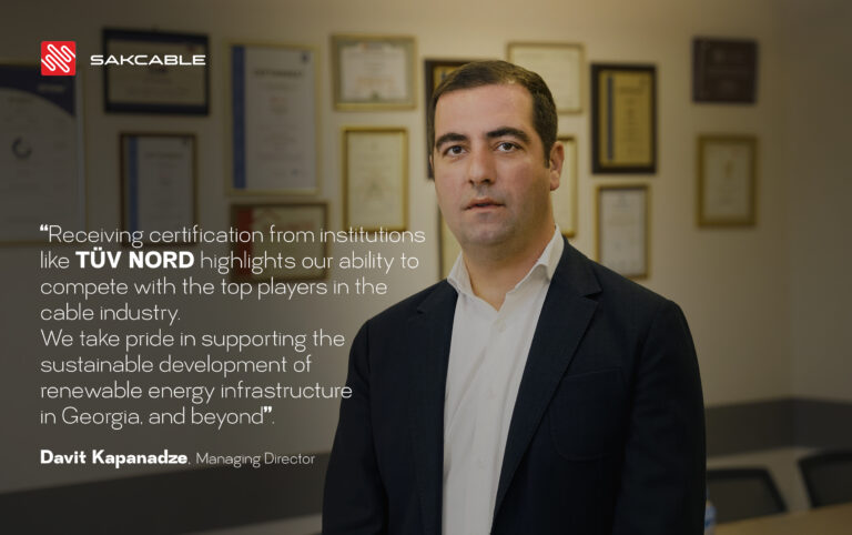 “We are pleased to announce the successful certification of our product, made possible with support from USAID’s Economic Security Program and the consulting firm ISO Consulting. The testing process was highly comprehensive—our product samples were sent to TUV NORD’s laboratory, where they underwent seven months of intensive testing. The cable was evaluated for various factors including: UV resistance, mechanical strength, electrical characteristics, insulation and casing composition, temperature resistance, and absence of halogen and corrosive gases, in compliance with EN 50618:2014 and IEC 62930:2017 standards. Alongside testing, a team of TUV NORD experts from Europe conducted a detailed study of our entire production process, from the machinery and raw materials to the final cable characteristics. After a thorough review, Sakcable’s Solar cable has earned another significant international recognition, proving that our products can compete with the industry’s leading players globally,” said Davit Kapanadze, Managing Director of Sakcable.